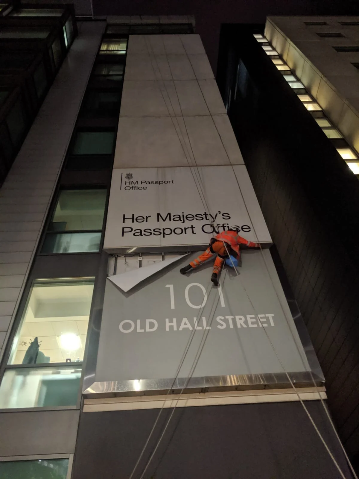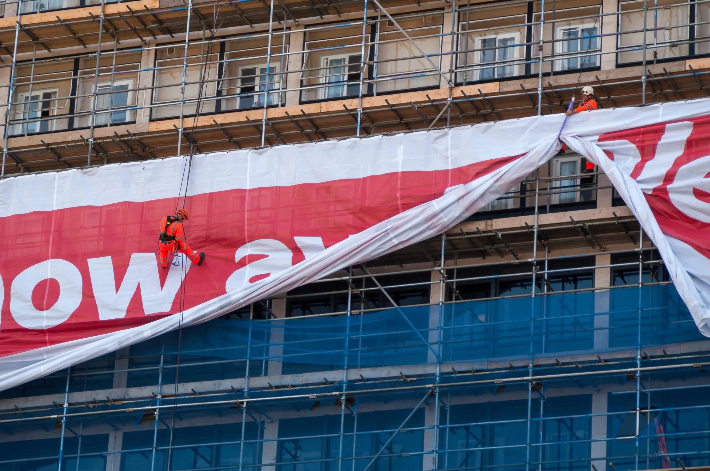 Using rope access to install, maintain and remove banners and signage has many advantages. Cost, time and disruption are kept to a minimum, and reach hard-to-access areas that can prove commercially or practicably unfeasible through other means of access.